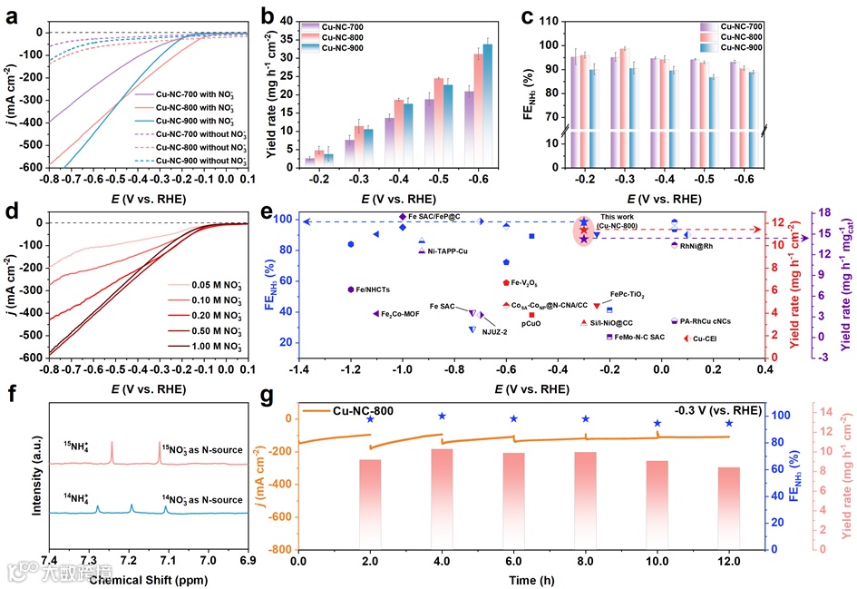 图4. a) LSV curves of Cu-NC-700, Cu-NC-800, and Cu-NC-900 in 0.5 M H2SO4 with and without 0.5 M NO3−. b) NH3yield rate, and c) FE of NH3 for all three samples in 0.5 M H2SO4 with 0.5 M NO3−. d) The LSV curves of Cu-NC-800 in 0.5 M H2SO4 with various concentration of NO3−. e) Comparison of NO3RR performance of Cu-NC-800 with other catalysts under acidic conditions. f) 1H NMR spectra of the electrolyte after NO3RR, using 14NO3−and 15NO3− as the nitrogen source. g) Consecutive recycling test results of Cu-NC-800 at −0.3 V vs. RHE。