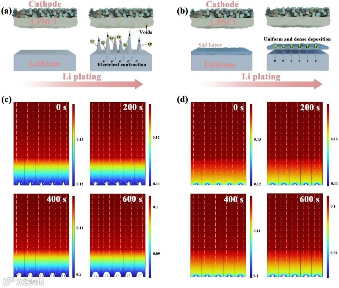图5 不同界面处锂沉积行为示意图:(a) Li/LPSCl, (b) HFA-FEC-Li/LPSCl;(c) 裸锂和(d) HFA-FEC-Li负极表面锂沉积过程的COMSOL模拟。
