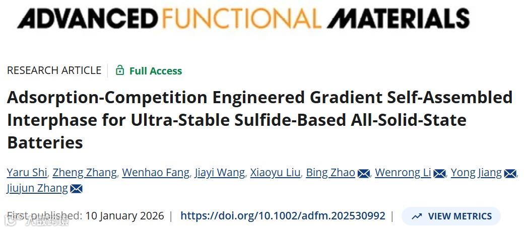 近日,来自上海大学的蒋永教授、李文荣教授、赵兵教授、张久俊院士等,在国际知名期刊《Advanced Functional Materials》上发表了题为“Adsorption-Competition Engineered Gradient Self-Assembled Interphase for Ultra-StableSulfide-Based All-Solid-State Batteries”的研究论文。该研究通过理论计算指导的吸附竞争策略,在锂金属表面构建了一种组分渐变的梯度自组装界面相,有效解决了硫化物固态电解质与锂负极间的界面不稳定难题,显著提升了全固态锂金属电池的循环寿命与倍率性能。