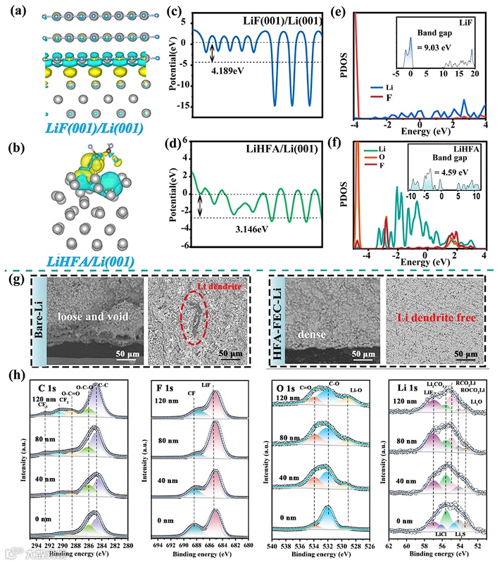 图4 (a) Li(001)/LiF(001)和(b) Li(001)/LiHFA的结构及差分电荷分布;(c) Li(001)/LiF(001)和(d) Li(001)/LiHFA的静电势分布图;(e) Li(001)/LiF(001)和(f) Li(001)/LiHFA的投影态密度(PDOS);(g) 第10次循环后Li/LPSCl和HFA-FEC-Li/LPSCl界面的BSE侧视图与俯视图;(h) 循环后HFA-FEC-Li负极表面的XPS深度剖析谱。