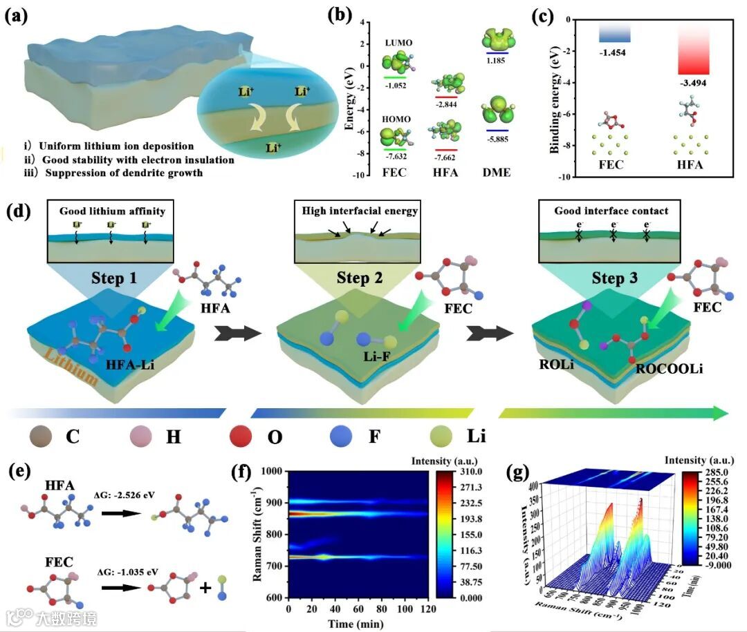 图1 定制界面层的设计原理。(a) 梯度SAI层示意图;(d) 基于(b) LUMO-HOMO能级和(c) 吸附机制在锂金属负极上设计的多层SAI层示意图;(e) HFA和FEC与锂反应的吉布斯自由能;(f, g) HFA-FEC混合溶液与锂反应的原位拉曼光谱变化。