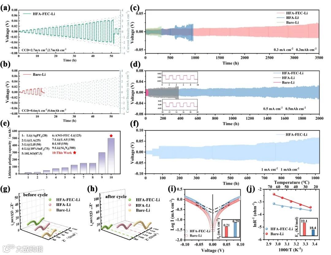 图3 对称电池的电化学性能。采用(a) HFA-FEC-Li和(b) 裸锂的Li|LPSCl|Li电池在逐步增加电流密度下的恒电流循环;采用HFA-FEC-Li、HFA-Li和裸锂的Li|LPSCl|Li电池在不同电流下的恒电流循环:(c) 0.3 mA cm⁻²和(d) 0.5 mA cm⁻²;(e) 与其它已发表工作的锂沉积容量对比;(f) 采用HFA-FEC-Li的Li|LPSCl|Li对称电池在0.2 mA cm⁻²和0.5 mAh cm⁻²下循环80小时后,于1 mA cm⁻²下的恒电流循环;(g, h) 采用HFA-FEC-Li、HFA-Li和裸锂的Li||Li电池在循环前后的Nyquist图;(i) Tafel图和(j) 活化能。