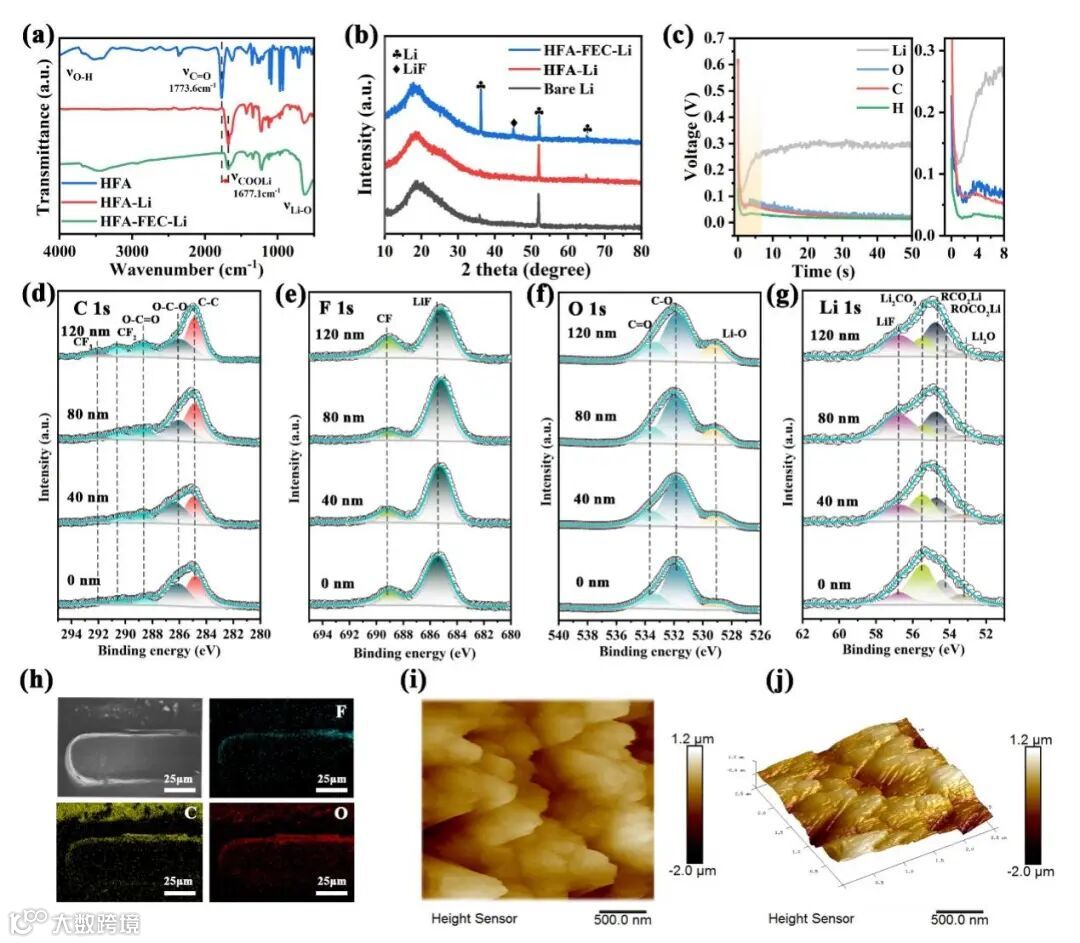 图2 定制SAI层的物理化学表征。(a) 红外光谱;(b) XRD;(c) GD-OES;(d) C 1s、(e) F 1s、(f) O 1s、(g) Li 1s的高分辨率XPS深度剖析;(h) 截面SEM图像及元素分布图;(i, j) AFM形貌图像。