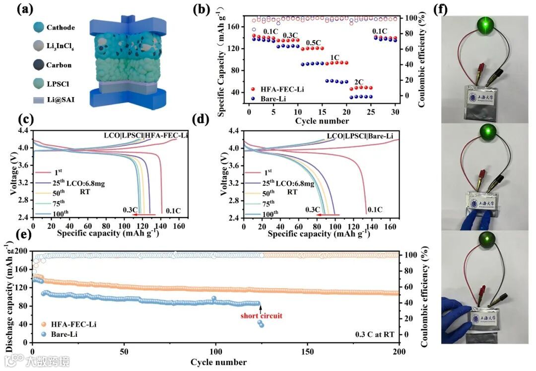 图6 (a) 包含复合正极、LPSCl SE和锂负极的全电池示意图;(b) 倍率性能,(c, d) 恒电流充放电曲线及(e) LCO|LPSCl|HFA-FEC-Li和LCO|LPSCl|Li全电池在0.3 C下的循环性能;(f) 为发光二极管(LEDs)供电的柔性软包电池照片及破坏性实验照片。