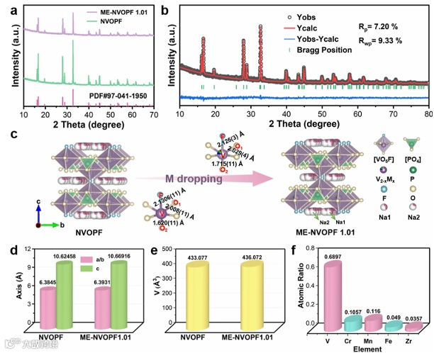 图1,a)NVOPF 和 ME-NVOPF 1.01 样品的 XRD 图谱;b)ME-NVOPF 1.01 的 Rietveld 精修结果;c)NVOPF 和 ME-NVOPF 1.01 的晶体结构示意图;d)NVOPF 和 ME-NVOPF 1.01 的晶格参数;e)NVOPF 和 ME-NVOPF 1.01 的晶胞体积;f)ME-NVOPF 1.01@C 中五种过渡金属元素的原子比。
