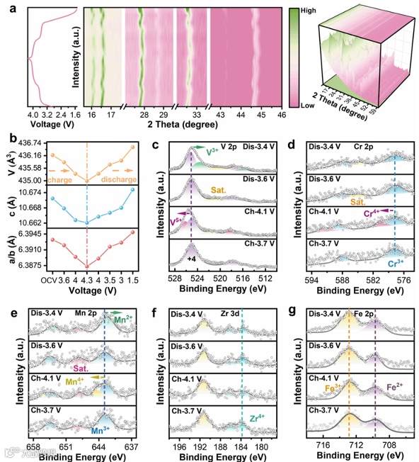 图5,ME-NVOPF 1.01@C储钠机制:a)非原位XRD测试曲线,b)对应晶胞参数变化。非原位XPS谱图:c)V 2p;d)Cr 2p;e)Mn 2p;f)Zr 2p和g)Fe 2p。