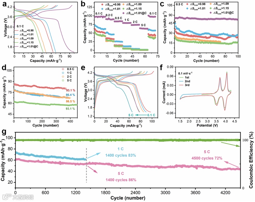 图3,一系列ME-NVOPF样品的电化学性能:a)0.1 C下,第二圈恒流充放电(GCD)曲线;b)0.1 C到5 C的倍率性能;c)0.5 C下的循环性能;ME-NVOPF 1.01@C 的电化学性能:d)在0.5 C、1 C、2 C 和 5 C 下的循环性能;e)0.1 C、0.2 C、0.5 C、1 C、2 C 和 5 C 下的恒电流充放电曲线;f)0.1 mV·s⁻1 下的前三圈循环伏安(CV)曲线;g)1 C和 5 C下的长循环性能及库仑效率。