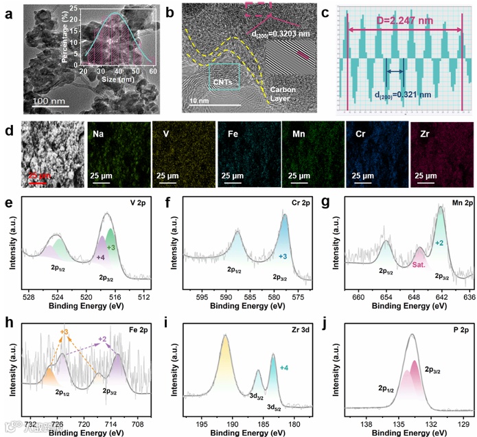 图2,a)ME-NVOPF 1.01@C 的 TEM 图像,插图显示颗粒尺寸分布;b)ME-NVOPF 1.01@C 的 HRTEM 图像;c)HRTEM 放大图像的傅里叶滤波变换;d)ME-NVOPF 1.01@C 的mapping;ME-NVOPF 1.01@C 的 XPS 高分辨率光谱:e)V 2p;f)Cr 2p;g)Mn 2p;h)Fe 2p;i)Zr 3d;j)P 2p