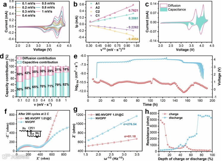 图4,ME-NVOPF1.01@C的动力学性能:a)不同扫描速率(0.1-1 mV s-1)下的CV测试曲线;b)v1/2与i之间的关系曲线;c)0.3 mV s-1下的赝电容贡献曲线;d)0.1-1 mV s-1下的赝电容贡献直方图;e)GITT测试曲线及Na+扩散系数变化曲线;f)NVOPF和ME-NVOPF1.01@C在2C下循环200次后的EIS曲线,插图显示EIS电路拟合图;g)Warburg效率拟合曲线;h)充放电深度电阻变化曲线。