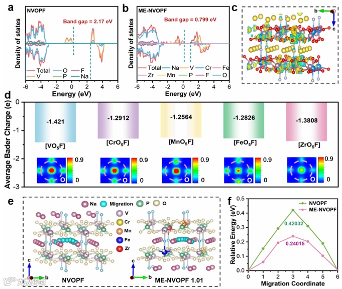 图6,态密度(DOS)图:a)NVOPF和b)ME-NVOPF 1.01;c)ME-NVOPF 1.01的差分电荷密度;d)ME-NVOPF 1.01晶体的[MO5F]八面体中氧原子的Bader电荷分析,插图为(001)平面上的电荷密度等值线图;e)NVOPF和ME-NVOPF 1.01的钠离子迁移路径,f)NVOPF和ME-NVOPF 1.01的Na+迁移能量势垒。