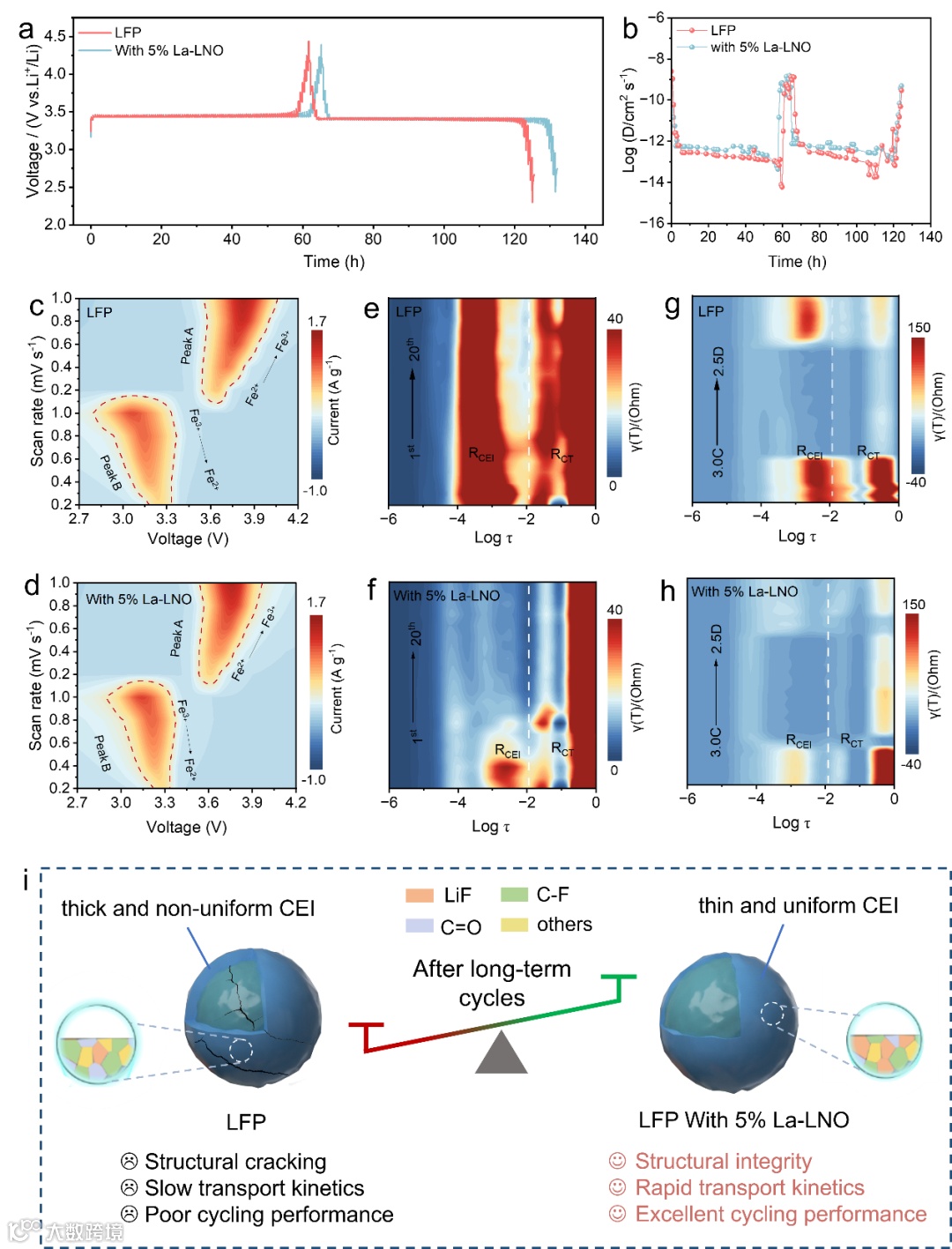 图6 锂离子传输动力学。(a) LFP阴极与添加5% La-LNO添加剂的LFP阴极的GITT曲线。(b) 相应的离子扩散系数。不同扫描速率(0.2-1 mV·s⁻¹)下,(c) LFP阴极和(d) 添加5% La-LNO添加剂的LFP阴极的循环伏安(CV)曲线等高线图。1-20圈循环过程中,(e) LFP阴极和(f) 添加5% La-LNO添加剂的LFP阴极的原位阻抗弛豫时间分布(DRT)演变图。不同充放电电压下,(g) LFP阴极和(h) 添加5% La-LNO添加剂的LFP阴极的原位阻抗弛豫时间分布(DRT)演变图。(i) 长期循环过程中,LFP阴极与添加5% La-LNO添加剂的LFP阴极的结构演变示意图。
