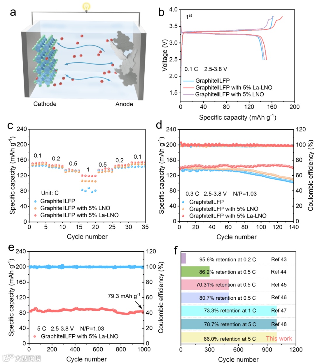 图7全电池性能测试。(a) 石墨阳极与LFP阴极组成的锂离子全电池示意图。(b) 0.1 C倍率下,2.5-3.8 V电位区间内的首次充放电(GCD)曲线。(c) 倍率性能图。(d) 石墨‖LFP、石墨‖添加5%LNO的LFP及石墨‖添加5%La-LNO的LFP在0.3 C倍率下的长期循环性能图。(e)石墨‖添加5%La-LNO添加剂的LFP全电池在5 C倍率下的长期循环性能图。(f) 添加5% La-LNO添加剂的LFP电极与已有报道相比的循环稳定性对比图。