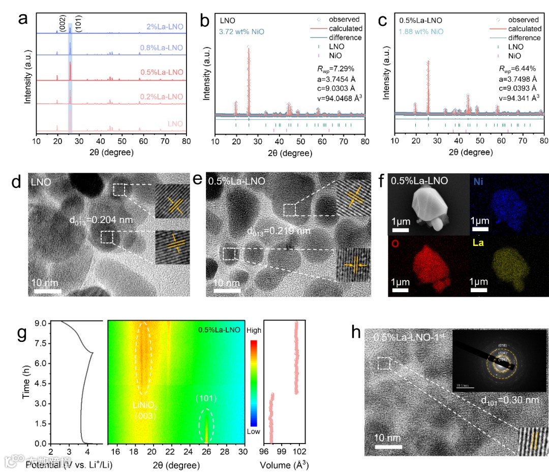 图2 结构与形貌表征。(a) 原始LNO与La掺杂LNO的X射线衍射(XRD)图谱。(b) LNO和(c) 0.5%La-LNO的Rietveld精修XRD图谱。(d) LNO和(e) 0.5%La-LNO的高分辨透射电子显微镜(HRTEM)图像。(f) 0.5%La-LNO的EDS mapping图像。(g) 0.5%La-LNO阴极在0.1 C倍率下初始充放电过程中主要特征衍射峰演变的原位XRD图谱。(h) 0.5%La-LNO阴极经初始循环后的透射电子显微镜(TEM)图像及电子衍射(SEAD)图谱。