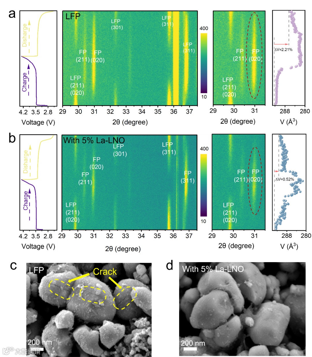 图 4 电化学可逆性研究(a)纯 LFP 正极与(b)添加 5% La‑LNO 的 LFP 正极在 0.1 C 首次充放电过程中,主要特征衍射峰演变的原位 XRD 图谱。循环 100 圈后(c)纯 LFP 正极与(d)添加 5% La‑LNO 的 LFP 正极的场发射扫描电镜(FESEM)图。