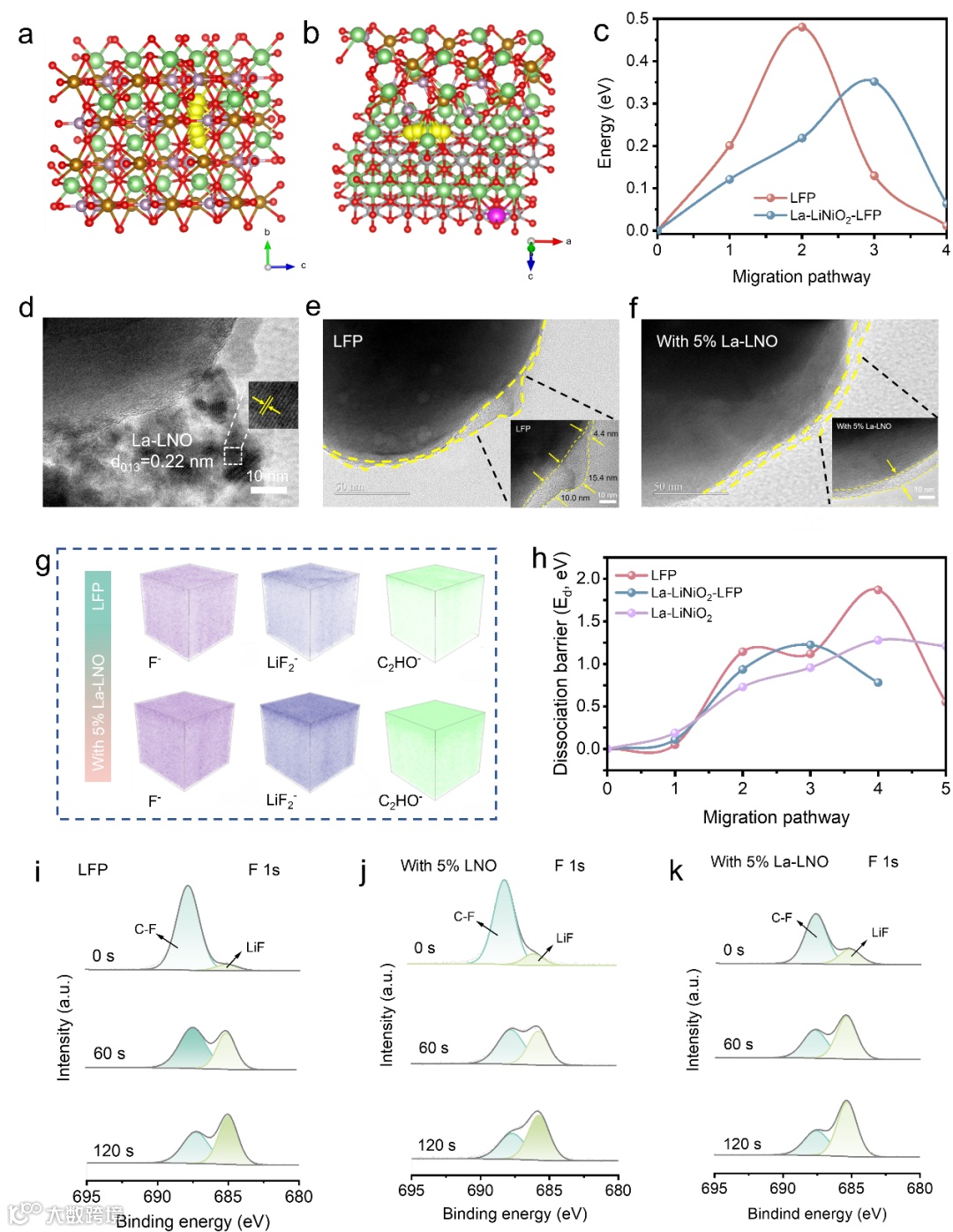 图 5 界面反应调控(a)纯 LFP 与(b)La-LiNiO₂-LFP 体系对应的 Li⁺扩散路径整体示意图。(c)锂离子扩散势垒。(d)循环前添加 5%La-LNO添加剂的 LFP 正极 TEM 图。循环 100 圈后,(e)纯 LFP 与(f)添加 5% La-LNO 添加剂的 LFP 正极 CEI 膜的 HRTEM 图对应区域。(g)纯 LFP 与添加 5% La-LNO 添加剂的 LFP 正极在第 100 圈循环后的 TOF-SIMS 结果。(h)LFP、La-LiNiO2及 LFP-La-LiNiO2电极界面处 P–F 键的结合能(Ed)。循环 100 圈后,在(i)纯 LFP、(j)添加 5% LNO 添加剂的 LFP、(k)添加 5% La-LNO 添加剂的 LFP 正极上形成的 CEI 膜的 F 1s XPS 谱图。