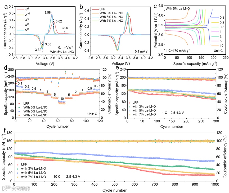 图 3 半电池性能测试。(a) 含 5% La‑LNO 添加剂的 LFP 电极在 0.1 mV s⁻¹ 下前 5 圈的循环伏安(CV)曲线。(b) LFP、含 3% La‑LNO、5% La‑LNO 及 7% La‑LNO 添加剂的 LFP 电极在 0.1 mV s⁻¹ 下第二圈的 CV 曲线对比。(c) 含 5% La‑LNO 添加剂的 LFP 电极在不同电流密度下的充放电(GCD)曲线。(d) 倍率性能。(e) 1 C 下长循环性能。(f) 10 C 下长循环性能。