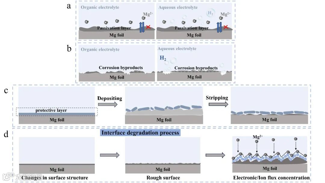 图3 (a) 镁金属在有机与水系电解质中的钝化行为示意图。(b) 镁金属在有机与水系电解质中的腐蚀过程示意图。(c) 镁金属沉积/剥离过程中的体积变化示意图。(d) 镁金属负极的界面退化过程示意图。