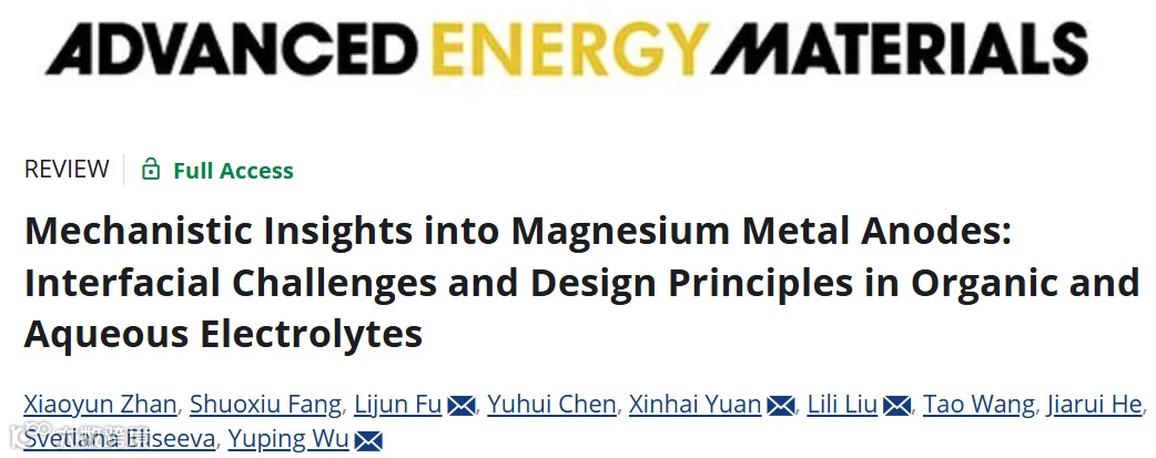 近日,来自南京工业大学/东南大学吴宇平教授-付丽君教授研究团队在电化学领域知名期刊Advanced Energy Materials 发表重磅综述文章,题为 “Mechanistic Insights into Magnesium Metal Anodes: Interfacial Challenges and Design Principles in Organic and Aqueous Electrolytes”。该文章深入解析镁金属负极在有机和水系电解质中的界面失效机理,涵盖溶剂化-去溶剂化耦合作用、寄生反应、沉积/剥离动力学及力学演化等核心问题,系统总结电解液配方、人工界面层、合金化策略及 3D 载体结构等设计方案,为镁金属电池的实用化突破奠定基础。
