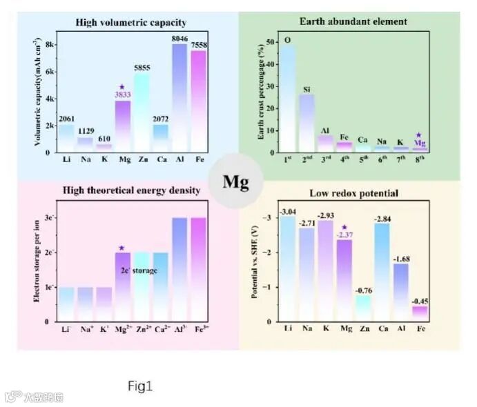 图2 镁金属负极核心优势示意图:高体积容量、高丰富、高理论能量密度及低氧化还原电位。