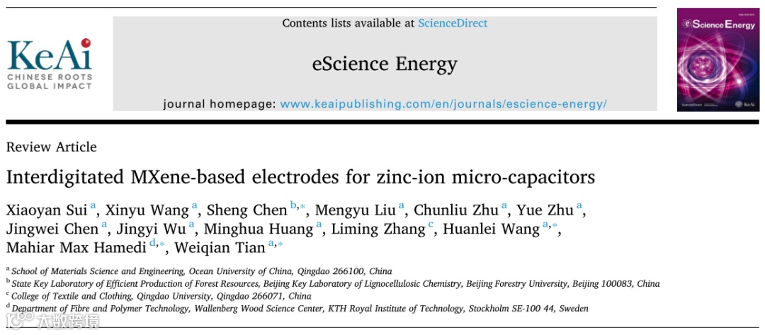中国海洋大学田维乾教授团队联合瑞典皇家理工学院、北京林业大学单位系统梳理了 MXene 基叉指型锌离子微型电容器的最新研究进展,从储能机理、电极制备技术、器件性能优化到现存挑战与未来展望进行全面阐述,相关综述论文以 “Interdigitated MXene-based electrodes for zinc-ion micro-capacitors” 为题发表于eScience Energy。中国海洋大学田维乾、王焕磊,北京林业大学陈胜,瑞典皇家理工学院 Mahiar Max Hamedi为该论文的共同通讯作者,中国海洋大学隋晓燕为该论文的第一作者。