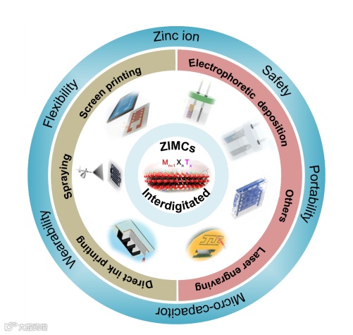随着可穿戴、便携式电子设备及植入式医疗器件的飞速发展,柔性微型储能器件的需求日益迫切。柔性叉指型锌离子微型电容器(ZIMCs)因成本低、安全性高、储能性能优异成为研究热点,而二维 MXene 材料凭借独特的层状结构、超高电子电导率和高电荷存储能力,是制备 ZIMCs 叉指电极的理想材料。目前 MXene 基叉指型 ZIMCs 在电化学机理、电极结构设计等方面已取得诸多进展,但仍面临电极片堆叠、离子传输速率低、制备工艺适配性不足等挑战,且缺乏针对该领域的系统性综述总结,制约了其进一步的研发与应用。