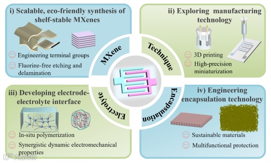 4. 剖析领域发展挑战并展望未来研究方向:指出MXene绿色规模化合成、电极可规模化制备、电极-电解质界面稳定性、器件封装技术适配性四大核心挑战;针对性提出开发绿色合成方法、突破3D打印功能墨水技术、构建动态协同凝胶电解质、研发生物相容可降解封装材料四大未来研究方向。