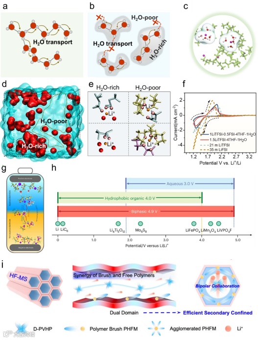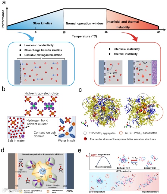 电解液作为电池体系中的关键组成部分,其结构与性质直接决定了离子传输、界面反应以及整体电化学性能。长期以来,电解液设计主要基于“均一溶液”假设,即体系在空间上均匀分布,离子以平均溶剂化结构存在,相关性能可以通过化学组成调控实现优化。在这一框架下,高浓度电解液、局域高浓度电解液以及共溶剂体系等策略相继发展,在一定程度上拓展了电化学稳定窗口并改善了界面稳定性。然而,这些方法往往面临动力学与稳定性难以兼顾的问题,例如高黏度导致离子传输受限、溶剂结构调控缺乏普适性等。近年来的实验与理论研究逐渐表明,即使在宏观均一的液体体系中,离子和溶剂分子也可能在纳米尺度上自发组织形成不同的微结构,而这些“看不见的结构”会深刻影响离子传输、界面反应以及电化学稳定性。真实的电解液更像是一种具有复杂内部结构的软物质体系。在这种状态下,溶剂分子/盐阴离子或其他电解液组分在微观尺度自发聚集,而体系在宏观上仍保持均一。这种非均结构源于能量与熵的复杂耦合,并表现出与传统均一液体截然不同的性质演化规律,例如导电性、黏度和比热容的异常非线性变化。在前期工作(Advanced Materials 2024, 36, 40, 2405913)中基于水系电池体系首次提出分子微观非均性电解液(Molecular Mcroheterogeneous Electrolytes, MMHEs)的概念,并以醚溶剂为示例,成功诱导分子自组装成交替分布的“富水域”与“贫水域”,并揭示水团簇在连接微观结构参数与宏观电解液性能之间起关键作用 (J. Am. Chem. Soc. 2025, 147, 38, 34721–34730)。该工作不仅开辟了理解和调控水系电解液反应性的全新路径,也为高性能水系电池的设计提供了突破性的思路。此外,在非水电池中,溶剂重组(Solvent Reorganization,ACS Energy Lett. 2023, 8, 1, 477–485),离子溶剂簇JACS Au 2024, 4, 5, 1986–1996)也成功通过构建具有空间分工的微结构区域,在一定程度上解耦离子传输、界面稳定性与电化学窗口之间的内在矛盾,为电解液性能优化提供新的设计思路。