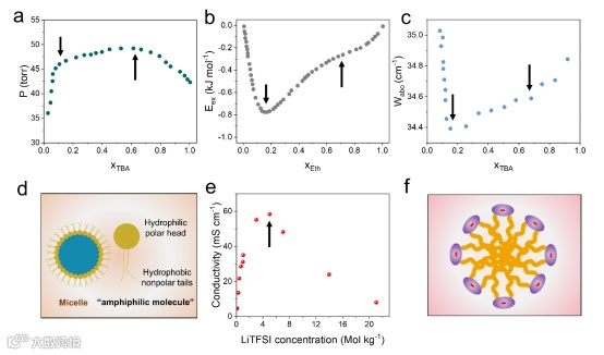 图2 (a)总蒸气压与水-叔丁醇混合物摩尔分数的关系(b)水-乙醇混合物的超焓(c)水-丁醇混合物的吸光度频率(d)复杂液体中的胶束结构(e)离子电导率与LiTFSI浓度的关系。(f)由“两亲性”TFSI阴离子构成的胶束示意图。
