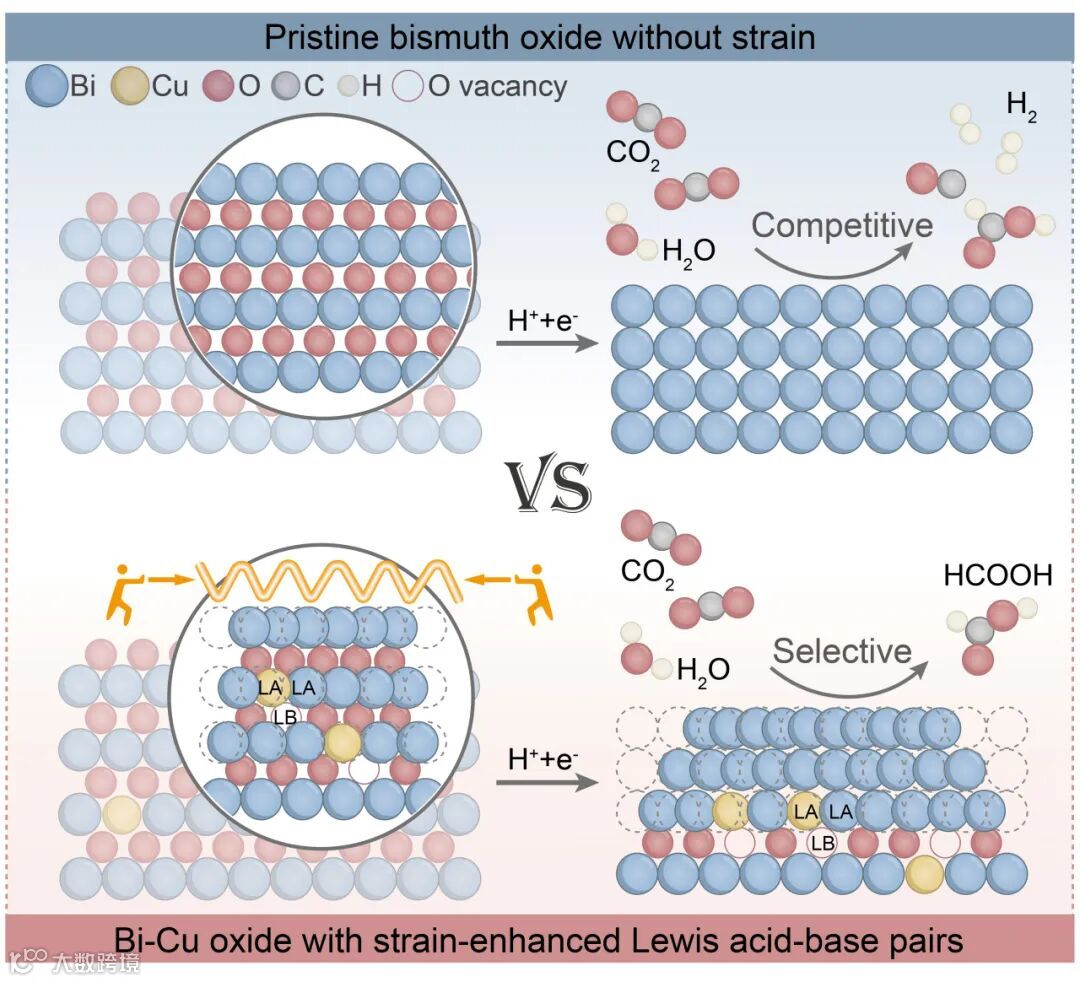 化石燃料燃烧导致CO2过度排放,加剧气候变化,电催化CO2还原为甲酸/甲酸盐是实现碳循环利用的重要途径。当前,铋基催化剂虽然具有高选择性,却面临工业级电流密度下活性衰减快、稳定性不足的瓶颈。尽管晶格应变工程被广泛用于调节催化性能,但多数研究仍停留于表观性能与应变的相关性,缺乏对应变下活性位点局域电子结构及协同机制的深入揭示,制约了高效催化体系的设计。