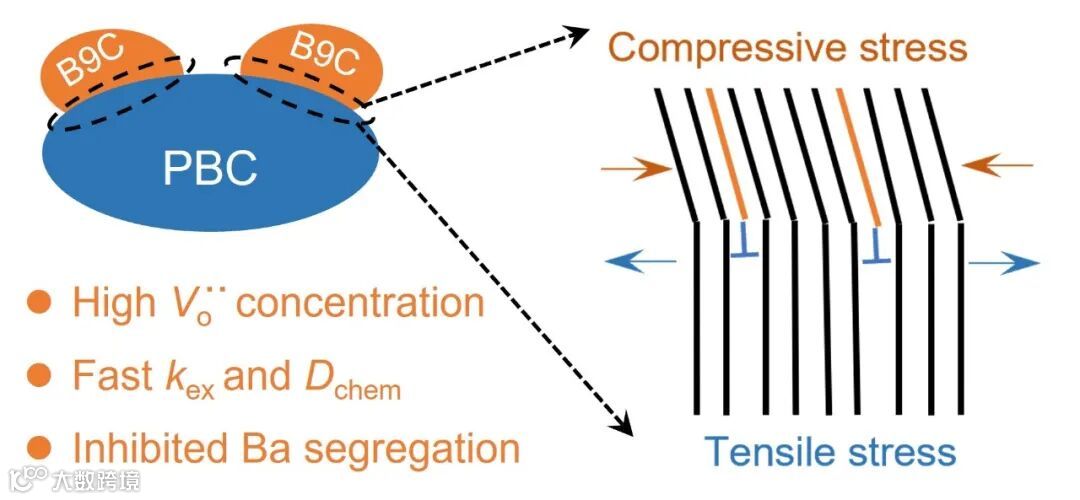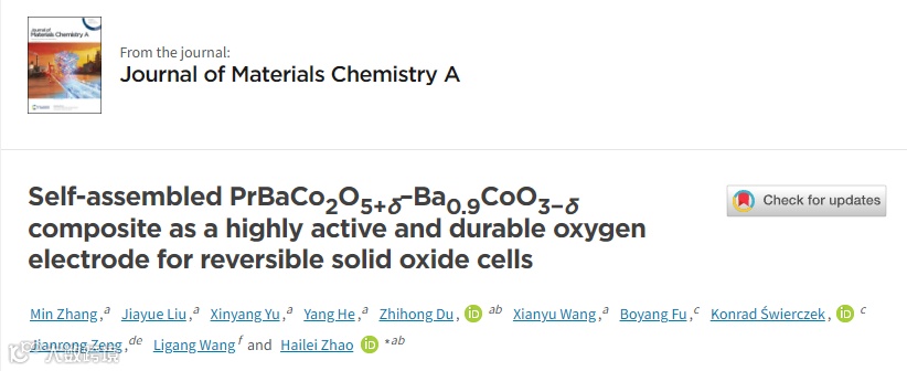 近日,来自北京科技大学的赵海雷教授,在国际知名期刊Journal of Materials Chemistry A上发表题为“Self-assembled PrBaCo2O5+δ-Ba0.9CoO3-δ composite as highly active and durable oxygen electrode for reversible solid oxide cells”的文章。该文章针对PBC氧电极材料低温催化活性低和化学稳定性差的问题,采用原位复合的方法引入第二相B9C材料。B9C具有极高的氧空位浓度和较高的结构对称性,显著加快了氧表面过程,并有效降低了电极反应活化能,提高了材料的催化活性。此外,两相之间存在错配位错界面,该界面为PBC提供了拉伸应力,有效抑制了Ba元素的偏析,提高了材料的化学稳定性。