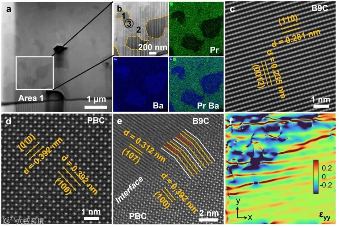采用HR-STEM观测PBC-B9C复合材料的晶格结构和界面结构,结果如图3所示。EDS结果表明,图3a中灰色区域为PBC相,黑色区域为B9C相。图3c中,计算得到的两组晶面间距0.281和0.235nm,分别对应于B9C相的(110)和(0012)晶面。图3d中晶面间距均为0.392nm的两组晶面分别对应于PBC相中的(100)和(010)晶面。在两相界面处,B9C相中的每6个(107)晶面与PBC相中的5个(100)晶面对应,表明有错配位错缺陷的存在。且GPA结果表明,该位错缺陷的存在为PBC相提供了拉伸应力。该应力的存在可以增大PBC相的晶胞体积,释放晶格应力,从而可抑制Ba元素的偏析。