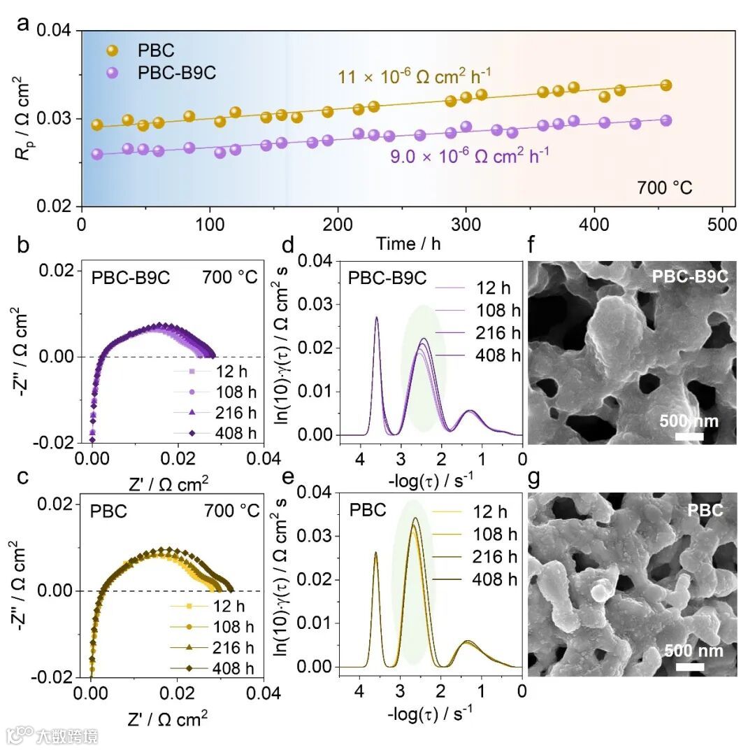 为评估复合材料的长期运行稳定性,制备对称电池,测试其在700 °C下随时间变化的EIS并拟合其阻抗值。在经过456 h的测试后,PBC电极的极化阻抗从0.029增加到0.034 Ω cm2,PBC-B9C电极的极化阻抗从0.026增加到0.030 Ω cm2,阻抗增长率分别为11 × 10-6和9.0 × 10-6 Ω cm2 h-1,表明PBC-B9C复合电极的长期运行稳定性略好于PBC材料。采用SEM对PBC和PBC-B9C电极运行后的电极表面进行形貌观测。经过456 h的测试后,PBC电极表面可以观察到许多纳米粒子,纳米粒子的形成与Ba偏析有关。在长期运行过程中,Ba偏析到表面并与空气中的CO2反应形成BaCO3,而BaCO3的形成会降低电极反应活性位点同时降低材料的电导率,继而导致电荷转移过程减缓,最终表现为极化阻抗的增加。PBC-B9C电极经长期运行过后的表面也出现了一些纳米颗粒,但尺寸远小于PBC,表明PBC-B9C具有更强的化学稳定性。该结果可能与B9C的引入有关,B9C增加了Ba的表面化学势,缓解了Ba的偏析。同时,复合材料的两相界面存在错配位错缺陷,该缺陷为PBC相提供了拉伸应力,释放了晶格应力,因此可以抑制Ba元素的偏析。