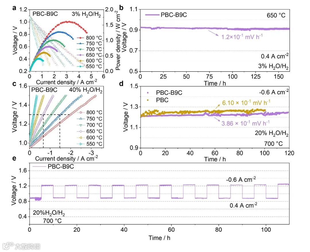 为评估PBC-B9C和PBC氧电极材料在FC和EC模式下的电化学性能,以Ni-GDC为燃料极,制备LSGM电解质支撑(~250 μm)的全电池。在FC和EC模式下,PBC-B9C复合氧电极材料均表现出较优异的性能。FC模式下,PBC-B9C基单电池在800、750、700、650、600和550 °C下的最大功率密度分别达到了1.61、1.27、1.00、0.79、0.60和0.40 W cm-2;EC模式下,1.3 V时,PBC-B9C基单电池在800、750、700、650、600和550 °C下的电解电流密度分别为1.96、1.49、1.04、0.66、0.39和0.19 A cm-2。PBC-B9C在EC和FC模型下均表现出较优异的电池性能主要归因于B9C的引入加快了电极反应动力学过程,降低了电极极化阻抗。此外,PBC-B9C基单电池表现出较优异的长期运行稳定性,其在FC和EC模式下的电压衰减率分别为1.2 × 10-1 mV h-1和3.9 × 10-1 mV h-1,优于PBC基单电池。