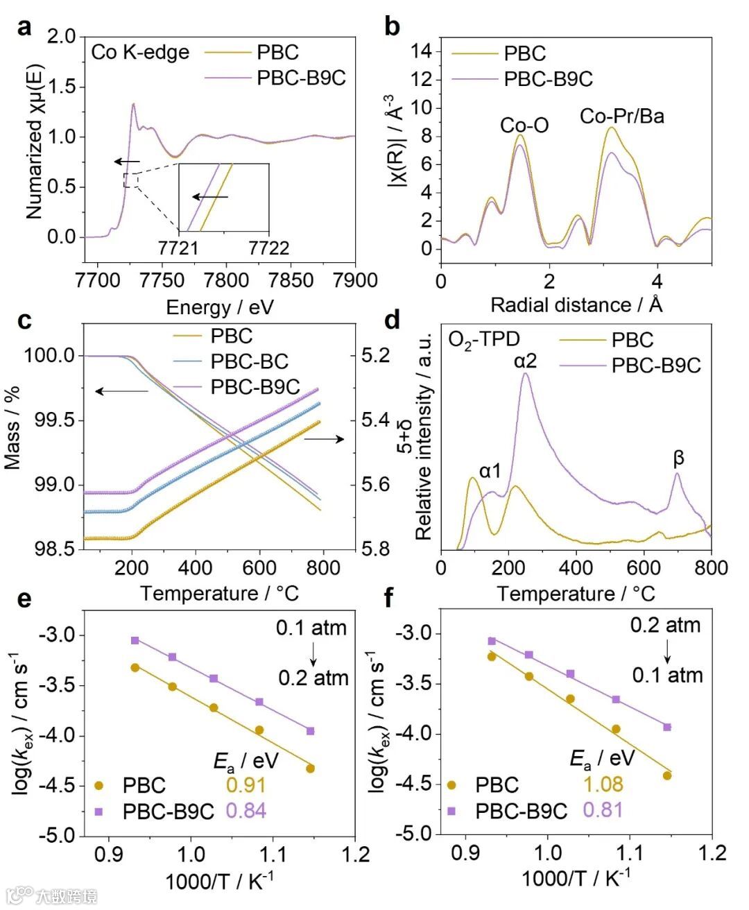 为定量分析复合材料的氧空位浓度,采用碘滴定的方法测试粉末样品在常温下的氧空位浓度,结合热重数据可计算材料随温度的氧空位变化。常温下,PBC-B9C和PBC样品在低温下的氧含量分别为5.62和5.76,其对应的氧空位浓度分别为0.38和0.24。该结果表明B9C的引入可以显著增加材料的氧空位浓度。随着温度的升高,粉末样品出现失重,对应于晶格失氧。高温下,PBC-B9C的失重量小于PBC,尽管如此,PBC-B9C在高温下的氧空位含量仍然高于PBC。在650 °C下,PBC-B9C和PBC样品的氧空位浓度分别为0.63和0.52。复合材料氧空位浓度的提高加快了氧表面交换过程和降低了活化能。从0.2到0.1 atm,PBC-B9C在800、750、700、650和600 °C下的氧表面交换系数(Kex)分别为8.4、6.1、4.0、2.1和1.1 × 10-4 cm s-1,而PBC在对应温度下的Kex分别为5.9、3.8、2.2、1.1和0.4 × 10-4 cm s-1,氧表面交换活化能从1.08降低到0.81 eV。PBC-B9C氧表面交换系数的显著提高和活化能的降低说明其可能具有更优异的氧还原/析出催化活性。