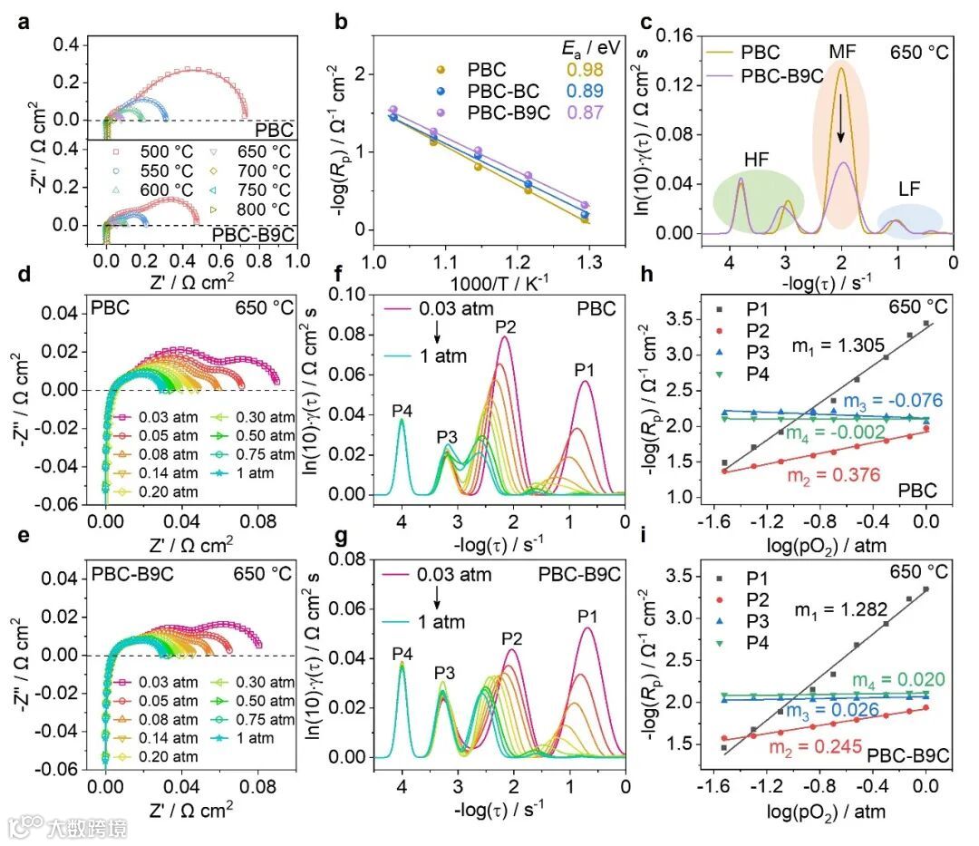 以LSGM为电解质,PBC和PBC-B9C为氧电极制备对称电池,测试其在空气气氛下的EIS以评估其催化活性。在700、650、600、550和500 °C下,PBC-B9C复合电极的极化阻抗分别为0.028、0.054、0.085、0.199和0.478 Ω cm2,PBC-BC的极化阻抗分别为0.036、0.065、0.105、0.258和0.638 Ω cm2,而PBC在对应温度下的极化阻抗分别为0.035、0.074、0.155、0.310和0.735 Ω cm2;表明PBC-B9C复合电极具有更优异的催化活性。引入B9C后,电极的电极反应活化能从0.98降低到0.87 eV。采用DRT解析材料的电极反应动力学过程,从低频到高频,P1、P2、P3和P4分别代表气体扩散、电荷转移,电极颗粒之间的氧离子迁移、电极和电解质之间的氧离子迁移过程。结果表明,电荷转移过程为PBC材料的限速步骤。而B9C的引入显著加快了该过程,继而降低了极化阻抗。该结果主要归因于B9C的引入显著提升了氧离子的传输过程,加快了氧离子的消耗,从而促进了电荷转移过程。