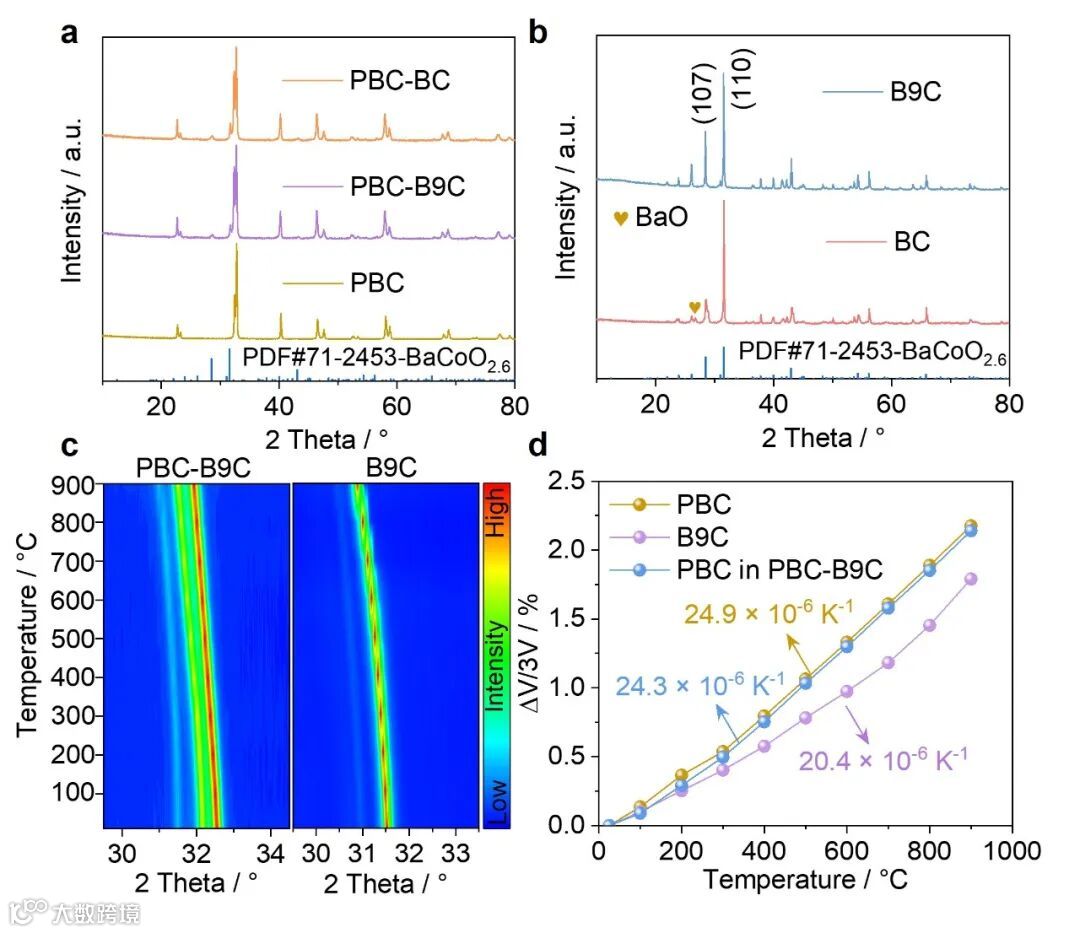 图2. 原位复合PBC-B9C材料物相结构和热膨胀结果图