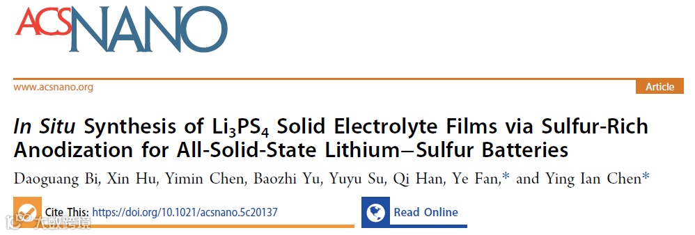 近日,来自澳大利亚迪肯大学的Ying (Ian) Chen教授团队,在国际知名期刊ACS NANO上发表题为“In Situ Synthesis of Li3PS4 Solid Electrolyte Films via Sulfur-Rich Anodization for All-Solid-State Lithium−Sulfur Batteries”的研究文章。该文章首次采用硫化物阳极氧化法在锂金属表面原位合成了具有高离子电导的Li3PS4固体电解质薄膜。使用阳极氧化法制备的Li3PS4固态电解质薄膜不仅厚度可控,而且相较于传统冷压法制备的硫化物电解质结构更为致密,孔隙/裂纹等缺陷更少。 该固态电解质薄膜既能用在液态电池中用于稳定的固态电解质界面层 (SEI),也能用于全固态电池的电解质,为发展超薄全固态锂硫电池提供了指引。