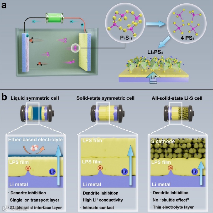 图1. (a) 原位合成硫化物电解质薄膜机理图。(b) 该薄膜材料在电池应用中的优势。