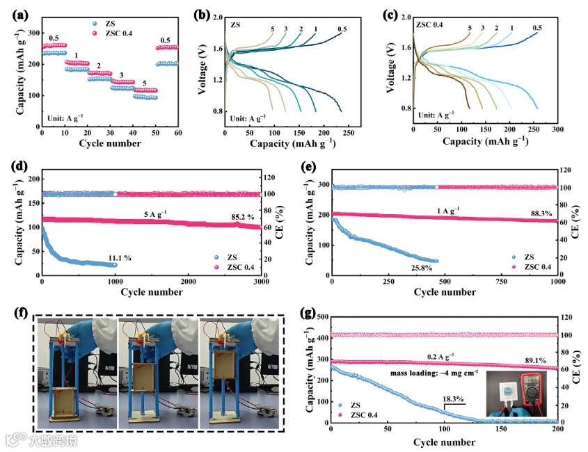 得益于新型电解液对锌负极/电解液界面微观结构与化学环境的调控,锌-锰电池表现出更优异的电化学活性及循环稳定性。在5 A g-1的电流密度下锌-锰电池循环3000次后,容量保持率仍为初始容量的85.2%。