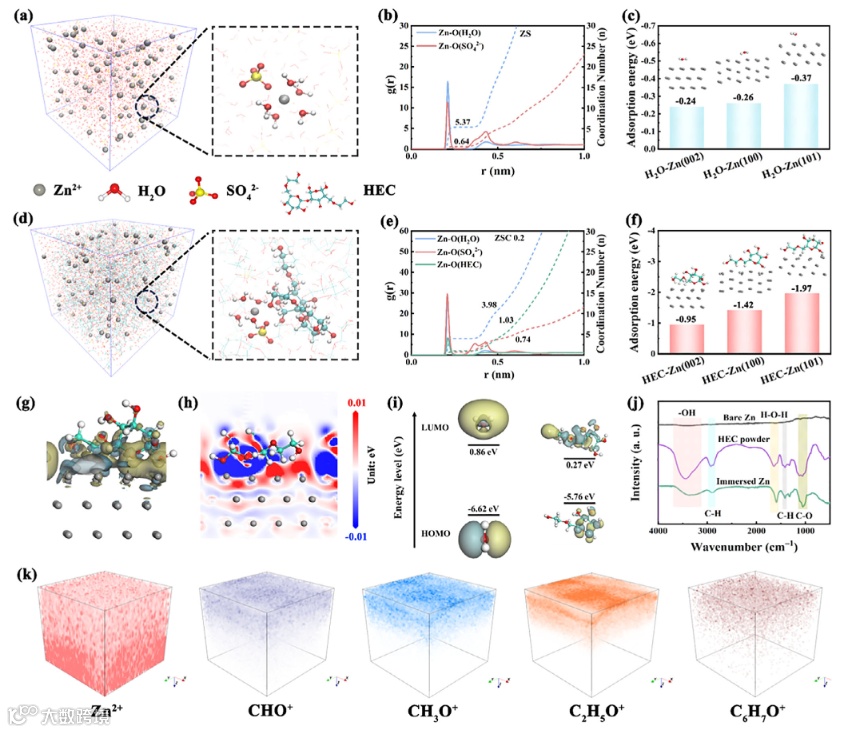 近日,来自江南大学的龙柱教授和戴磊教授,在国际知名期刊Advanced Energy Materials上发表了题为“Dynamic Regulation of Interfacial Micro-Environment for High Thermodynamics and Kinetics Enabling Stable and Reversible Zn Anode”的研究文章,该研究报道了一种新型电解液调控策略,通过引入一种纤维素衍生物分子添加剂实现了对锌负极与电极液界面的微观结构与化学环境的动态调控,添加剂分子通过与电解液组分和锌负极表面的相互作用,抑制了电解液中游离水与锌负极的接触,还促进了锌离子的去溶剂化过程及迁移过程,进而有效抑制了不良反应的发生,提高了锌负极的稳定性与可逆性。