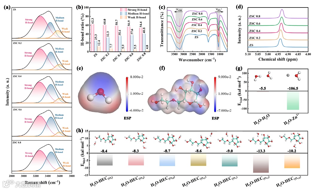 纤维素衍生物分子添加剂丰富的-OH极性基团能够与电解液中游离水分子之间形成新的氢键,抑制游离水分子的活性,进而抑制因游离水分子与锌负极之间较高的反应活性引发的析氢、腐蚀及副产物生成等。纤维素衍生物分子添加剂结构中富含-OH极性基团,这类基团具有较强的氢键供体/受体能力,能够与水系电解液体系中大量存在的游离水分子形成稳定的分子间氢键网络,可有效“捕获”电解液中的游离水分子,限制其自由运动能力,从而加速锌离子的脱溶剂化过程,并促进锌离子的迁移。