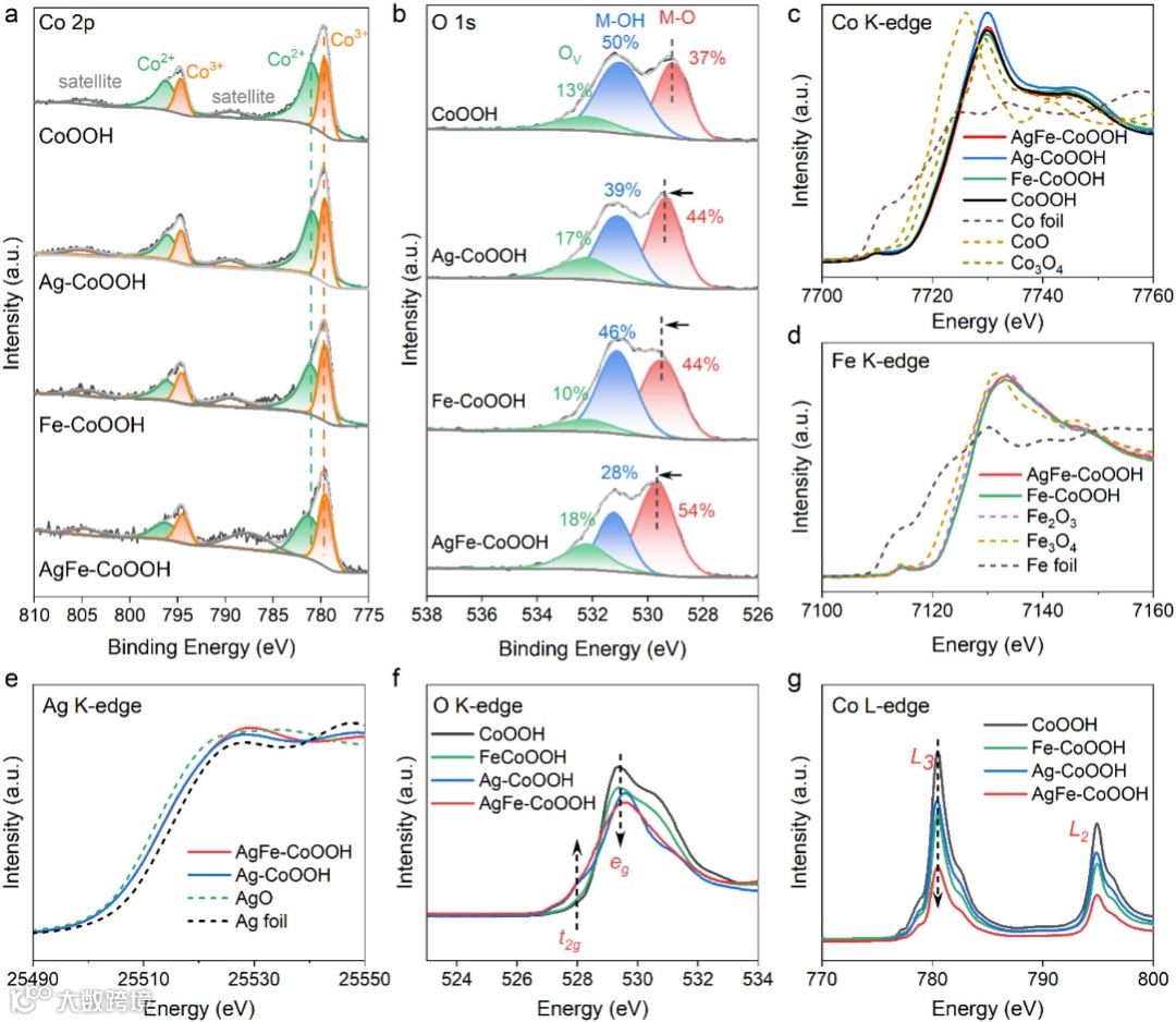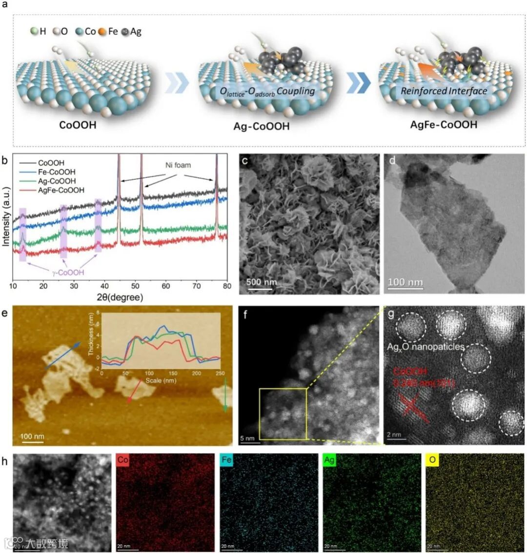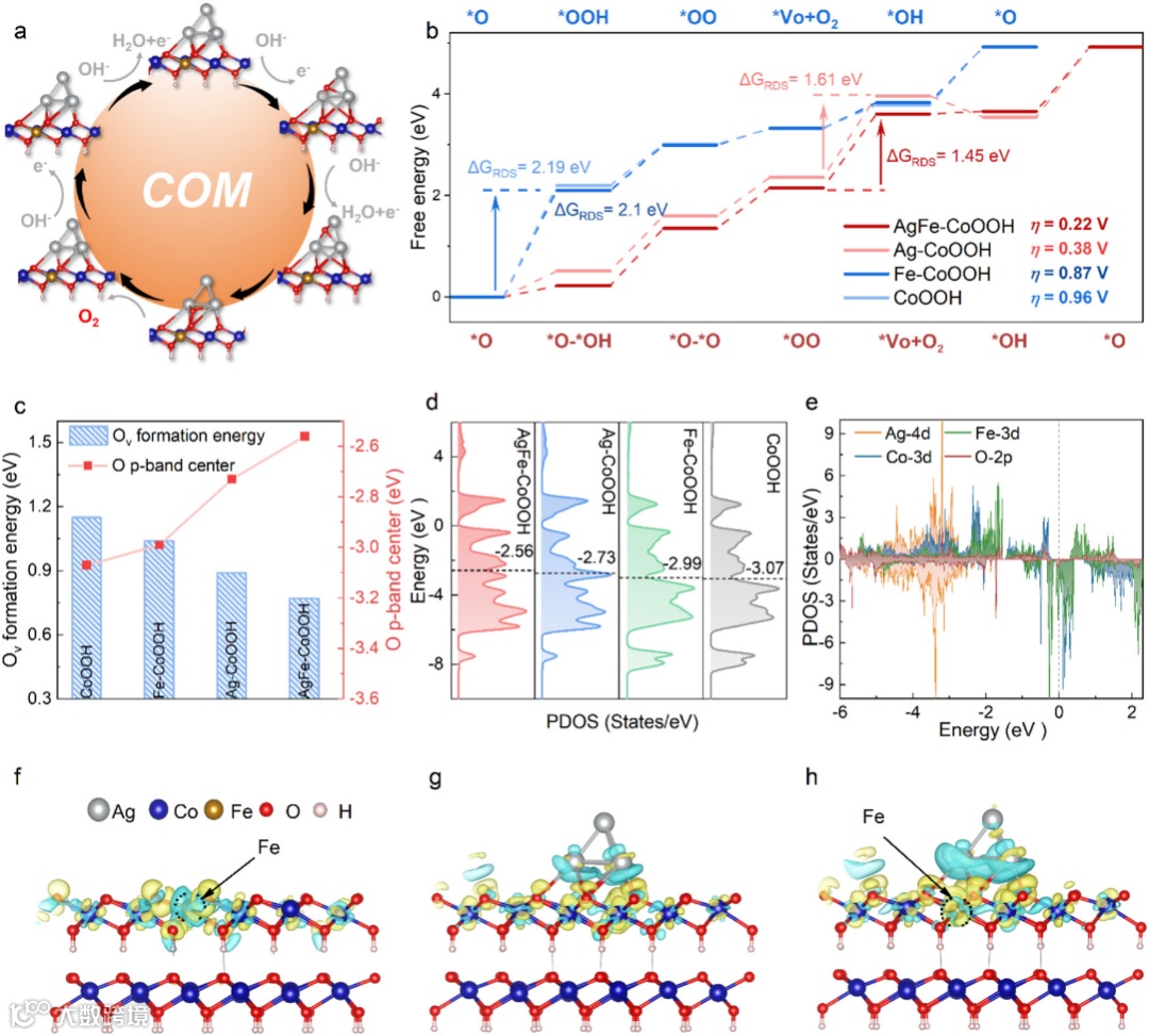 研究者通过电化学共沉积和离子交换,在泡沫镍上制备了AgFe-CoOOH催化剂。XRD和AC-TEM结果表明,该催化剂由γ-CoOOH纳米片(厚度约4 nm)和表面锚定的AgxO纳米簇(直径约3 nm)构成,两者形成异质界面。XPS和同步辐射XAS结果表明,Ag的价态介于0到+1之间,Co以+3价为主,Fe为+3价。与纯CoOOH相比,AgFe-CoOOH中Co-O键长缩短,Co 3d与O 2p轨道杂化增强,O p带中心更接近费米能级,表明晶格氧活性得到提高。