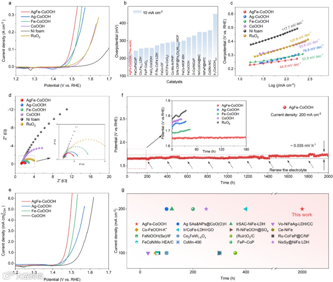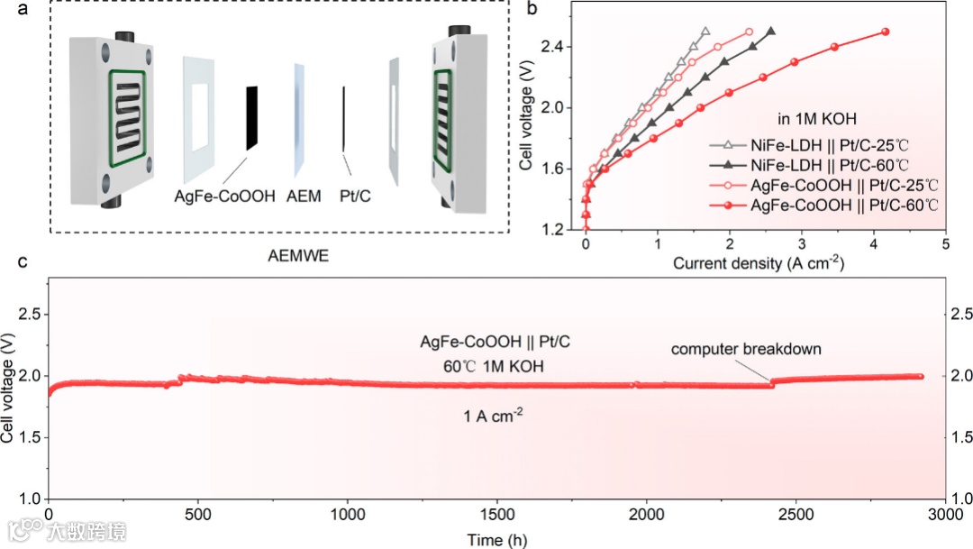 在三电极体系中,AgFe-CoOOH催化剂在10 mA cm-2电流密度下的过电位为220 mV,Tafel斜率为44.9 mV dec-1。在200 mA cm-2电流密度下持续运行近2000小时,电压衰减率约为0.035 mV h-1。在阴离子交换膜电解槽测试中,以AgFe-CoOOH为阳极、Pt/C为阴极的器件在60°C、1 A cm-2条件下可稳定运行近3000小时,达到相同电流密度所需电压(1.81 V)低于NiFe-LDH对照组(1.93 V)。稳定性测试后的表征显示,AgFe-CoOOH催化剂表面结构保持完整,Ag和Fe的溶出率较低,表明Fe掺杂有助于增强异质界面稳定性。