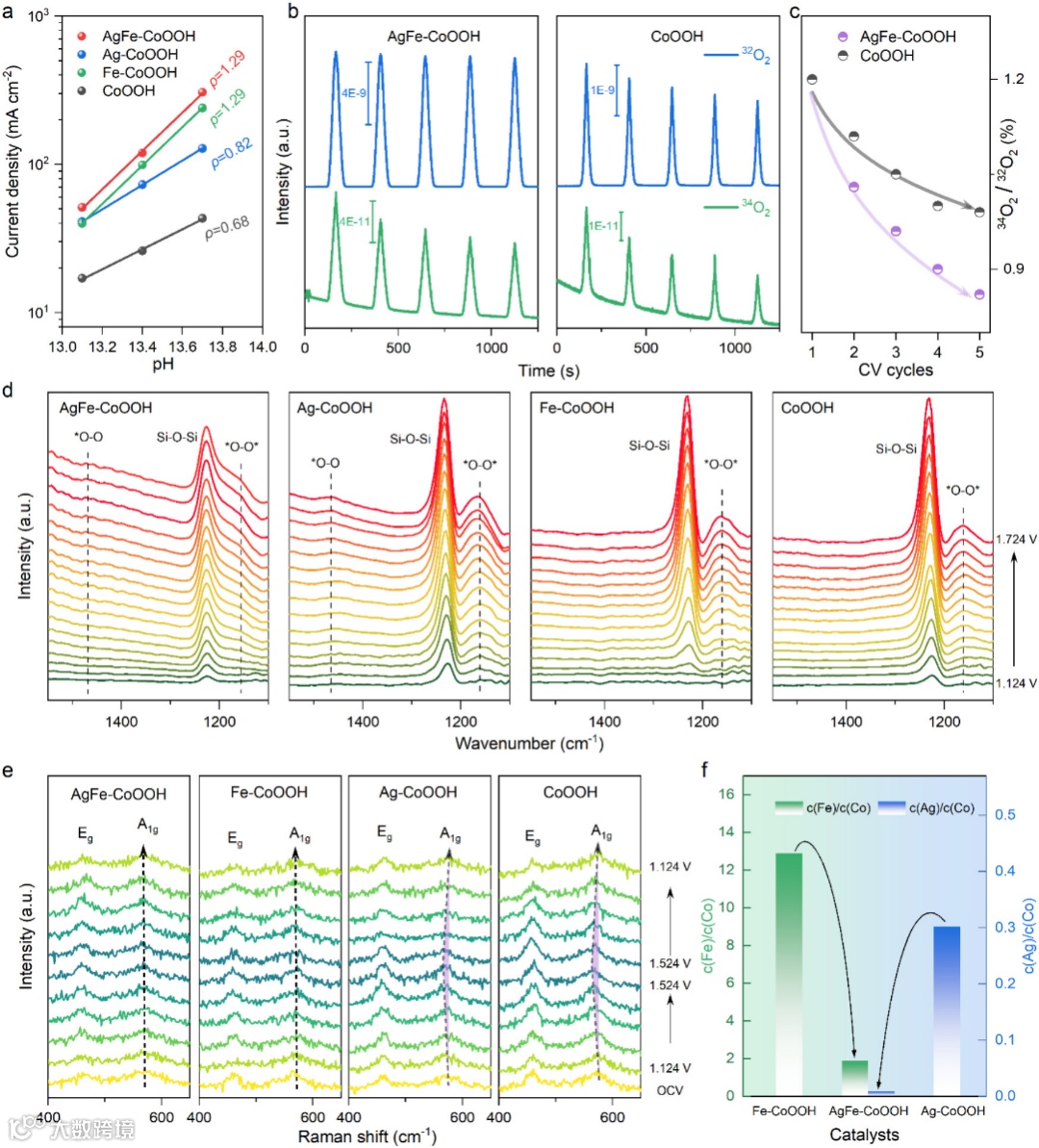 为探究反应路径,研究团队开展了一系列原位表征和DFT计算。pH依赖性测试和原位DEMS结果表明,催化剂OER中存在晶格氧参与,16O18O信号的检出直接证实了这一点。原位表面增强红外光谱检测到O-O等关键中间体,原位拉曼光谱则显示Fe掺杂可抑制Co的过度氧化。DFT计算进一步提出耦合析氧机制(COM):OH-吸附在Ag位点后脱质子生成O,随后与Fe激活的邻近晶格氧直接耦合生成O2。COM路径的决速步能垒为1.45 eV,低于传统AEM的1.81 eV和对比样品的LOM路径。差分电荷计算表明Fe掺杂增强了界面处的电荷相互作用,有效提升了界面稳定性。