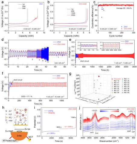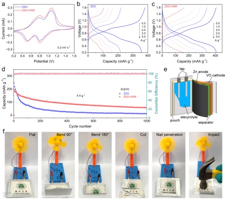 在界面动力学方面,ZSO-HAM不仅显著降低了锌离子去溶剂化的活化能,还促进锌离子主要以三维扩散模式进行均匀电沉积。得益于界面寄生反应和枝晶生长的有效抑制,使用ZSO-HAM的锌对称电池在1 mA cm-2和1 mAh cm-2的条件下稳定循环约3500小时。Zn||Cu半电池在300次循环中表现出极高的可逆性,平均库仑效率高达99.4%。在实际应用评估中,Zn||VO全电池在5 A g-1的高电流密度下稳定运行超过1000次循环,基于该体系的软包电池也展现了出色的柔性工作能力和容量保持率。