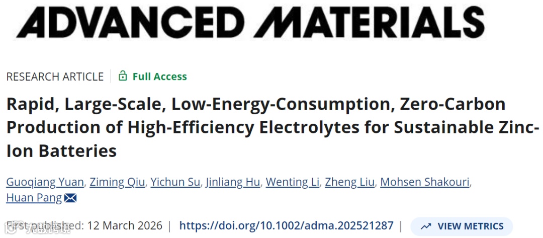 G. Yuan, Z. Qiu, Y. Su, et al. “Rapid, Large-Scale, Low-Energy-Consumption, Zero-Carbon Production of High-Efficiency Electrolytes for Sustainable Zinc-Ion Batteries.” Advanced Materials (2026): e21287.