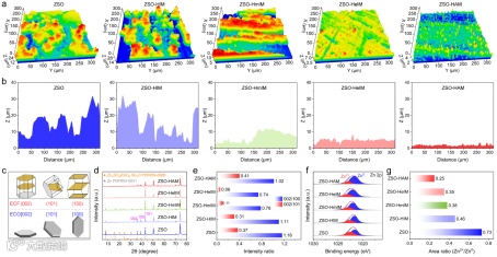 扫描电镜(SEM)和3D激光扫描显微镜(LSM)结果表明,咪唑基添加剂电解质促进了锌沉积的有序生长模式,显著降低了表面粗糙度。随着烷基支链的增大,支链诱导的空间位阻与亲锌配位位点之间产生协同作用。特别是ZSO-HAM电解液实现了最均匀和致密的界面沉积,XRD分析证实其促使沉积层高度暴露(002)晶面,这可能归因于HAM分子侧链上存在的亲锌位点(-NH2)。