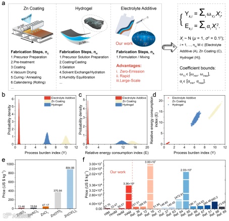 为评估工业转化潜力,作者利用蒙特卡洛随机模拟量化了不同锌负极改性路线的过程负担指数(Y)和相对能耗指数(E)。分析结果表明,电解液添加剂策略由于避免了干燥和退火等高耗能步骤,展现出卓越的过程鲁棒性和兼容性。在定义的参数空间内,相比于涂层改性和水凝胶策略,添加剂方法将相对能耗降低了高达96.8%。结合成本分析,该策略在“低工艺负担/低能耗”象限中占据主导地位,为实现碳中和目标下的低成本、大规模生产提供了清晰的途径。