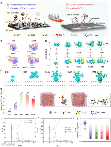 研究选取了四种具有不同侧链和取代位点的咪唑基配体分子(HIM、HmIM、HeIM和HAM)作为硫酸锌(ZSO)电解质的添加剂。咪唑基分子中具有高负电性的氮原子优先吸附在锌金属表面,形成致密的界面层。与H2O相比,咪唑分子具有更高的吸附能和更小的HOMO-LUMO间隙,诱导其在锌表面发生竞争性吸附以重建电极-电解质界面。咪唑基有机分子功能化侧链有效阻碍了界面水分子的聚集,从而从源头上抑制了析氢和腐蚀等副反应。