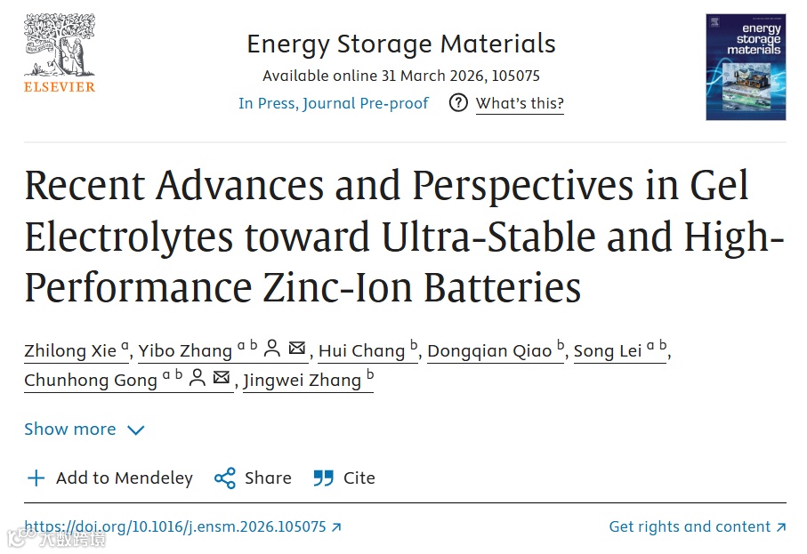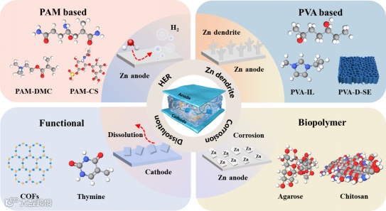 在凝胶聚合物电解质方面,生物基聚合物电解质(如壳聚糖、海藻酸钠)凭借丰富的官能团与Zn2+形成配位网络,在实现高离子电导率的同时显著提升Zn2+迁移数,通过协同螯合效应有效抑制副反应;功能型GPEs则通过共聚、共混及原位聚合等手段,将磺酸功能化共价有机框架等高比表面积功能单元引入聚合物基体构建高速离子传输通道,或通过离子竞争配位策略在锌阳极表面原位生成富氟固态电解质界面,实现从体相离子传输到界面稳定性的全面优化。从应用前景看,水凝胶电解质因结构简单、工艺兼容性高,在低容量柔性电子器件领域具备快速产业化潜力,但在循环寿命与能量密度方面存在局限;凝胶聚合物电解质则凭借更高的能量密度、更宽的工作温度范围和更优的安全特性,更适合面向高容量、高稳定性需求的储能系统,其商业化进程有待材料成本与制备工艺的进一步突破。